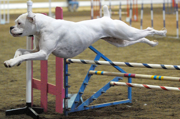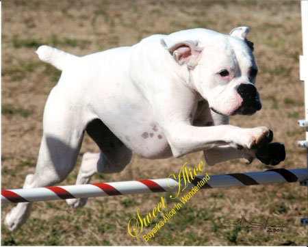 Sweet Alice is owned by Chris and Laurie Frodsham, and was sired by our dear Rhett. Chris and Laurie have done an amazing job with Sweet Alice, not only in the Rally ring but in the Agility ring as well. Laurie's biggest complaint about Alice is that she likes to go too fast! We are thrilled to bits to have played a small part in creating such a great example of a working boxer! Stay tuned for updated photos and news as Sweet Alice and the rest of the "Sea of White" continue their "working ways".